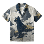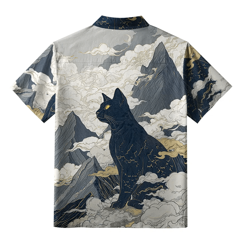 Crafted from breathable, lightweight fabric, this shirt offers both comfort and a bold statement. Its relaxed fit, short sleeves, and open collar preserve the laid-back Hawaiian shirt aesthetic, while the intricate artwork elevates it beyond casual wear. The dark hues of the cat contrast beautifully with the flowing clouds and golden highlights, creating a dynamic balance between stillness and movement.