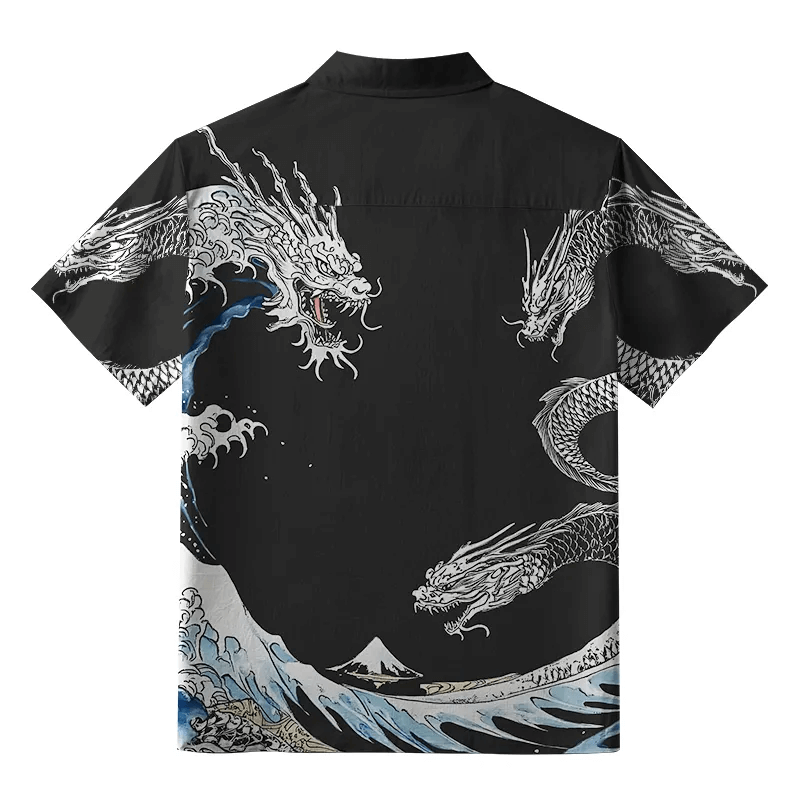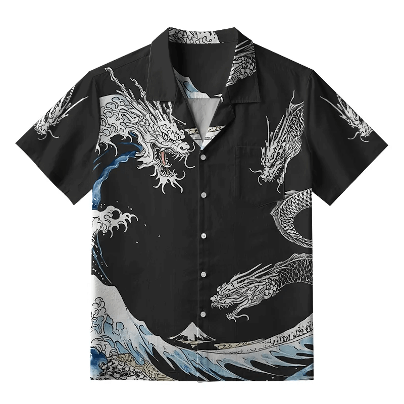 Crafted from lightweight, breathable fabric, this shirt ensures all-day comfort whether worn for a summer outing, a casual evening, or as a standout streetwear piece. Its black base enhances the contrast of the intricate dragon details and the fluid blue wave patterns, creating a visually striking balance between movement and calm. The relaxed fit, button-down front, and open collar preserve the laid-back Hawaiian shirt tradition while elevating it with symbolic artistry.