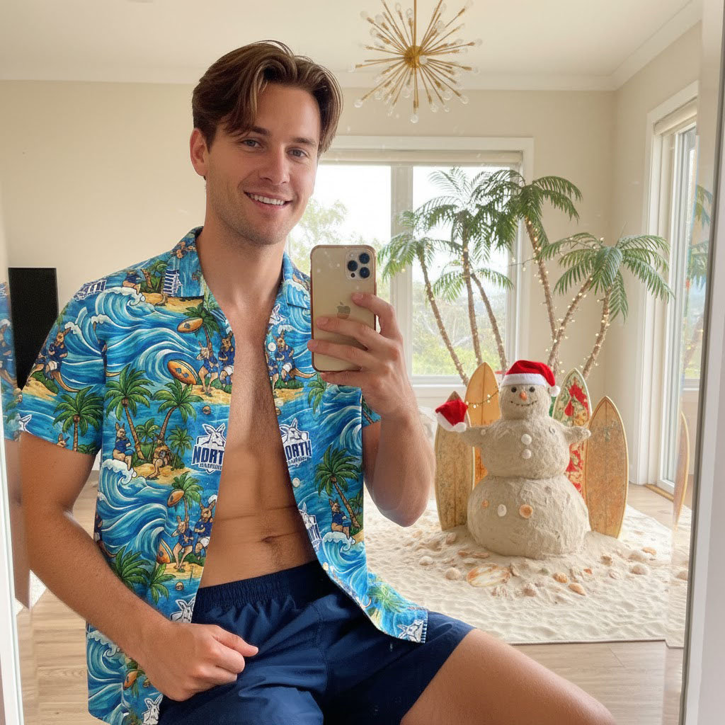 The design blends vibrant Hawaiian patterns with the unmistakable blue and white of the Kangaroos, creating a bold look that reflects both tradition and passion. Tropical motifs pair seamlessly with team graphics, celebrating the energy, pride, and excitement that come with every game. More than just casual apparel, this shirt is a wearable tribute to the dedication and loyalty that unite Kangaroos fans everywhere.